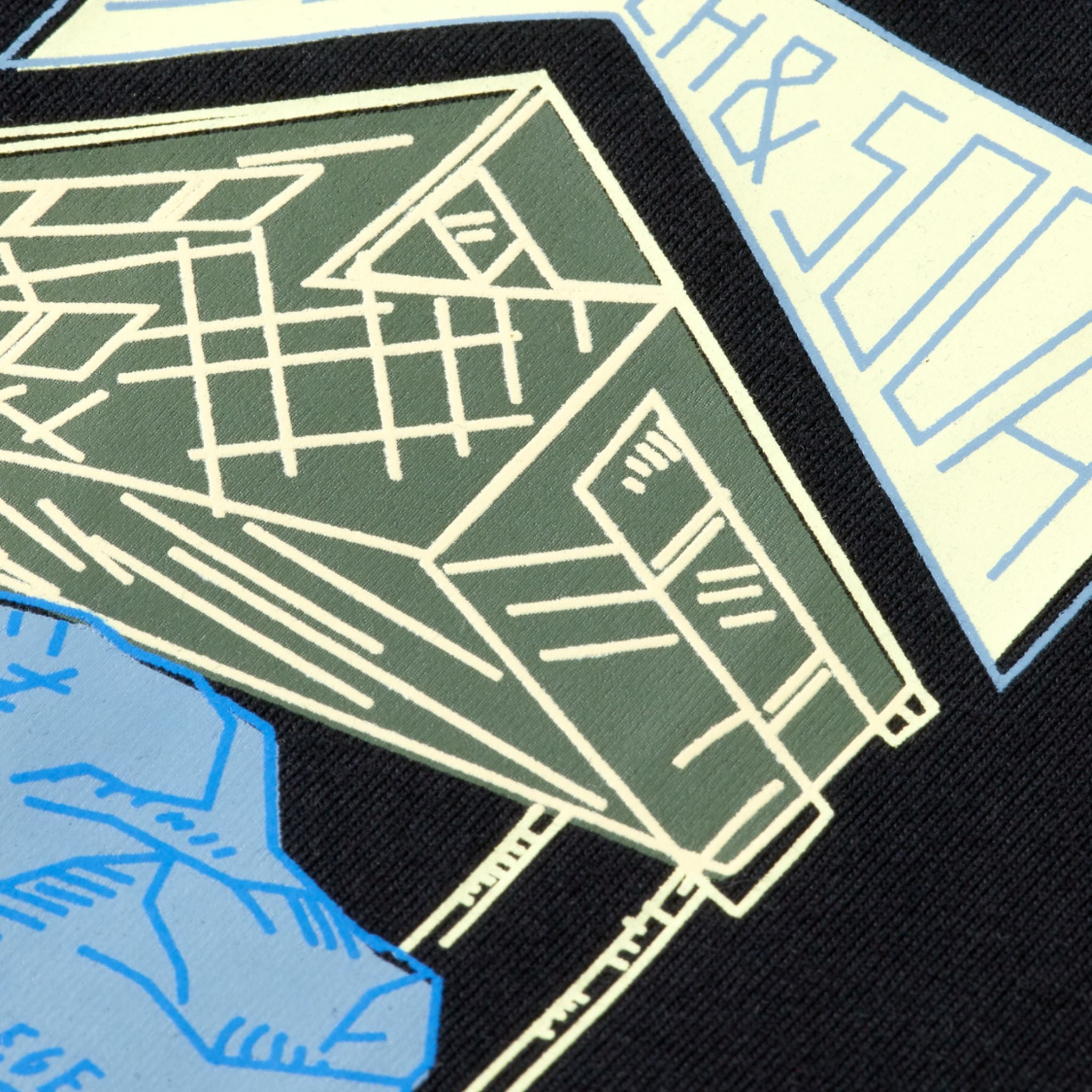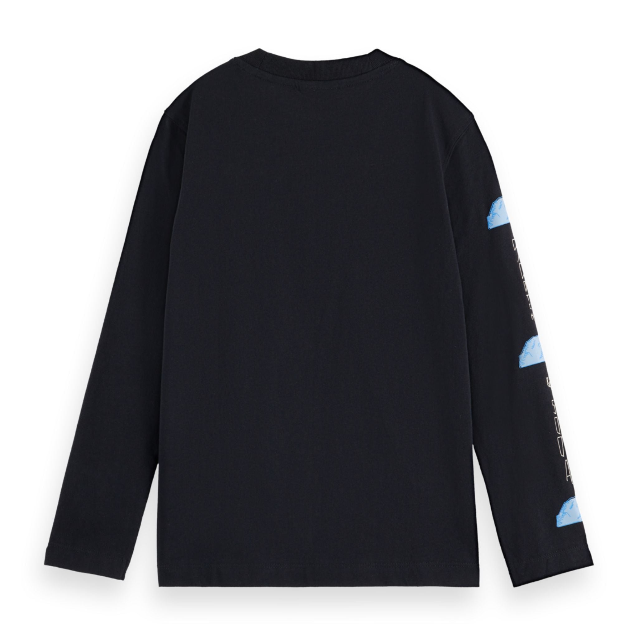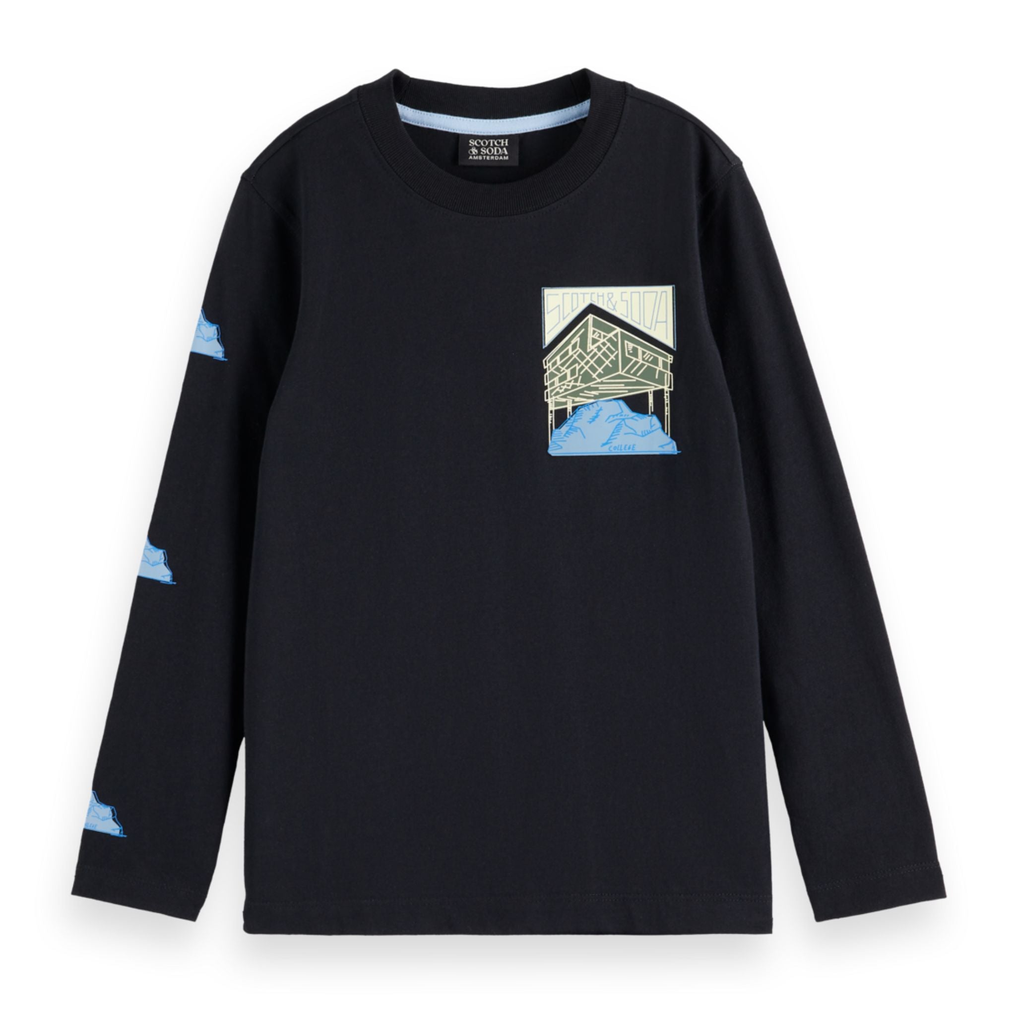 Print: Unieke frontprint op de borst met een grafisch huisje op blauwe bergen en de merknaam “Scotch & Soda” prominent zichtbaar