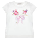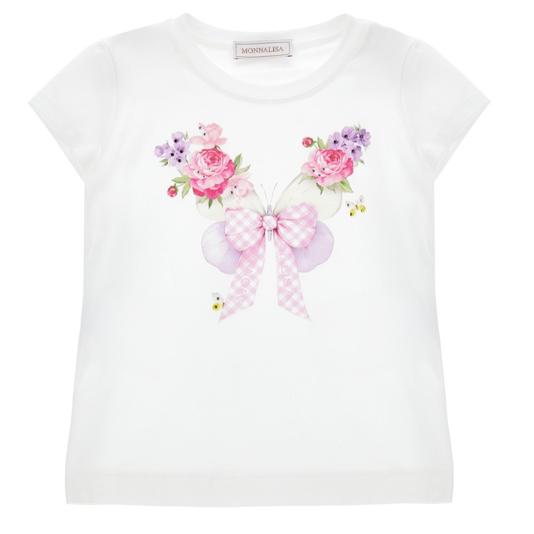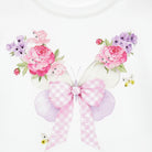 Dit schattige Monnalisa T-shirt in wit katoen is voorzien van een romantische bloemenprint en een roze geruite strik in het midden. De vrolijke kleuren en het girly design maken dit shirt perfect voor elke gelegenheid, van casual tot feestelijk.