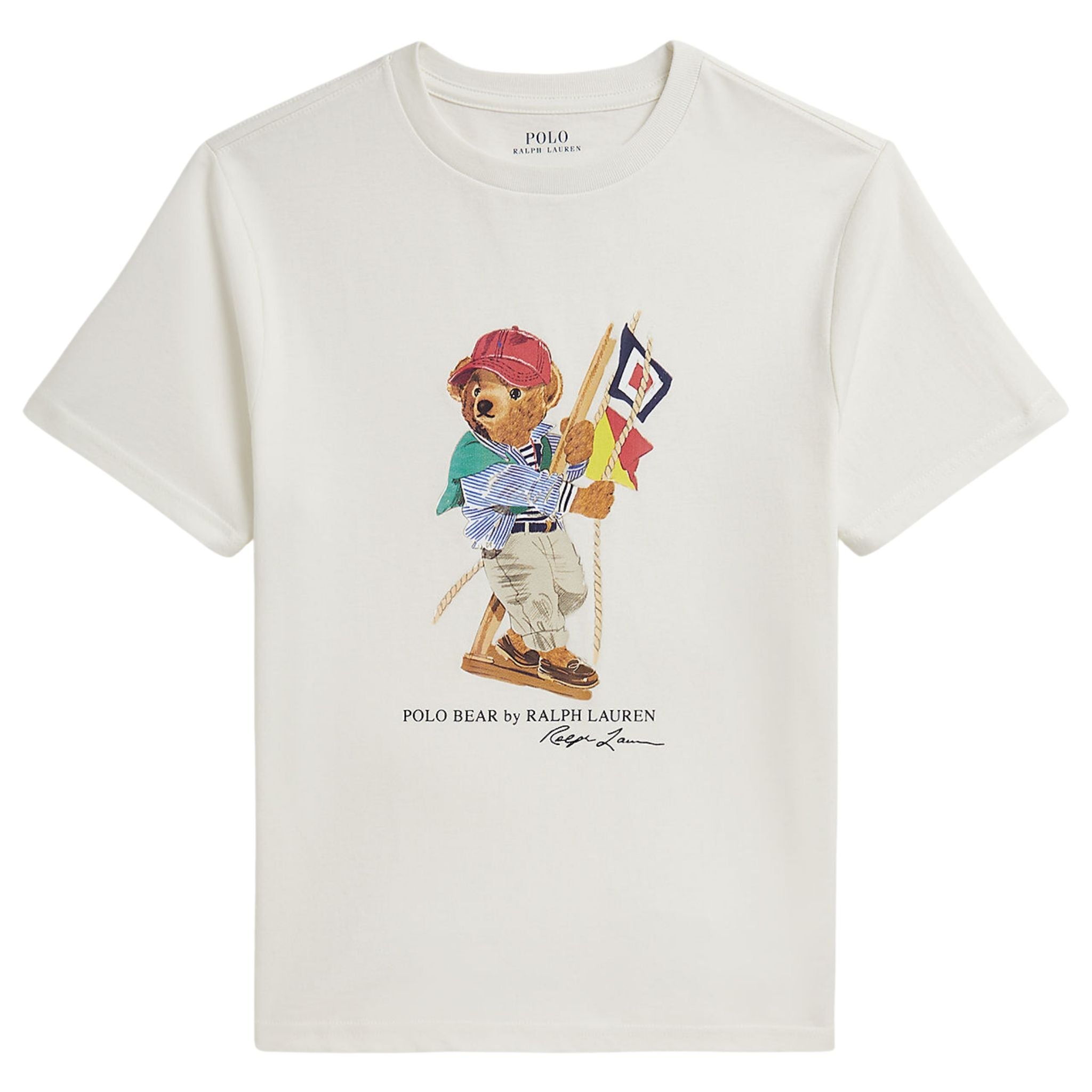 Dit jongens T-shirt heeft een frisse, zomerse uitstraling dankzij de off-white kleur en de iconische Polo Bear-print. De beer is afgebeeld in een maritieme outfit met vlaggen, wat zorgt voor een speelse maar herkenbare Ralph Lauren-look. Het shirt is gemaakt van zacht katoen en draagt comfortabel, ideaal voor warme dagen en dagelijks gebruik.