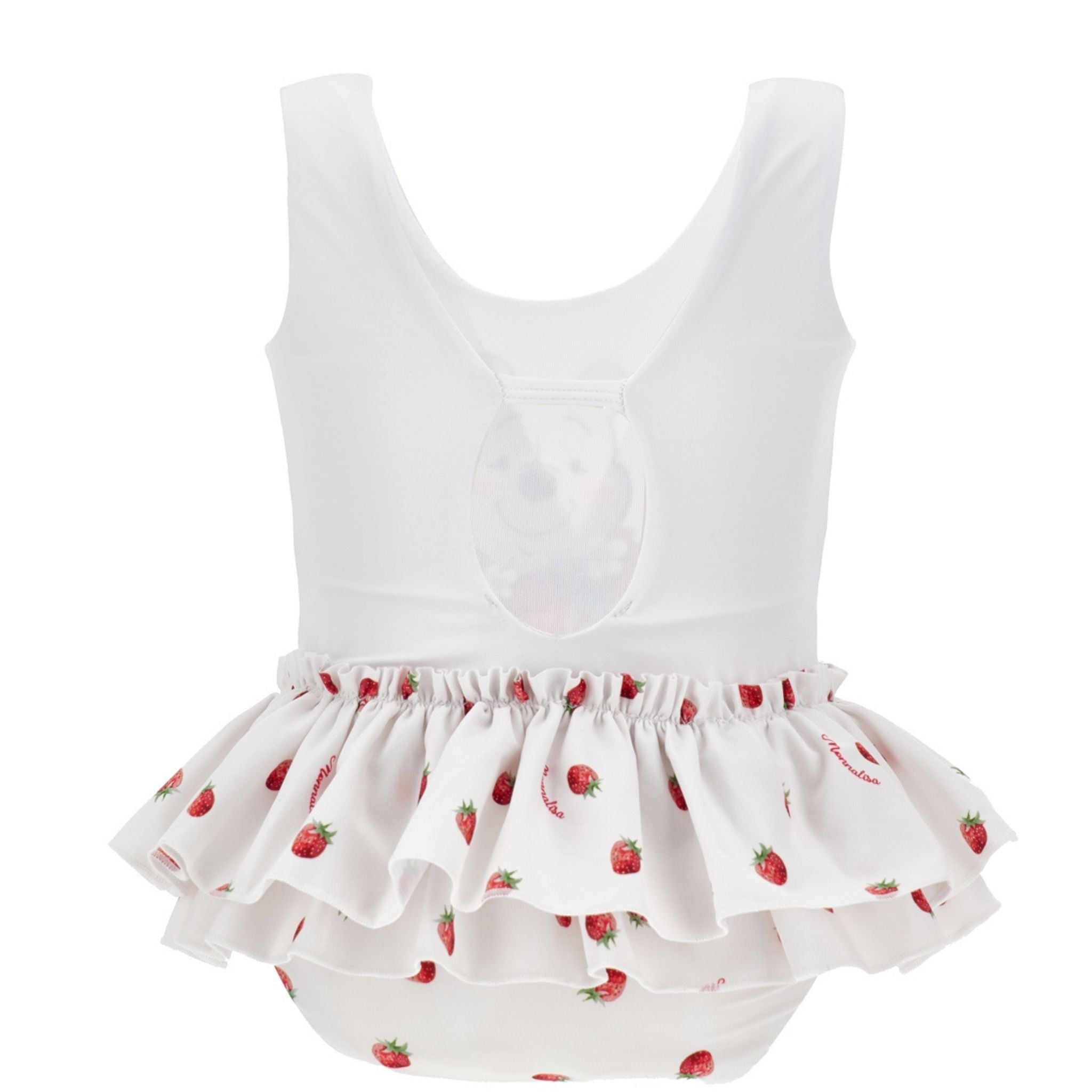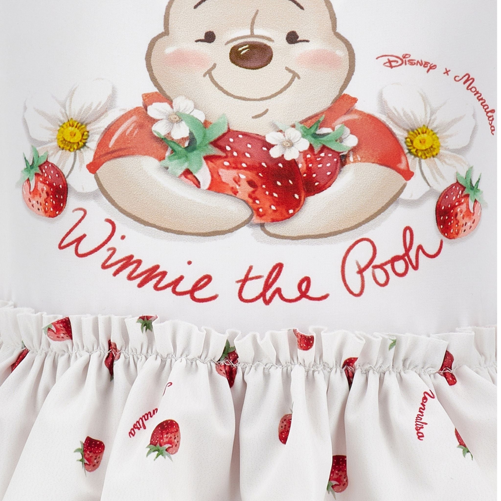 Dit witte Winnie the Pooh badpak van Monnalisa is ideaal voor zonnige dagen aan het strand of zwembad. Het badpak heeft een vrolijke print met aardbeien en Pooh, afgewerkt met schattige roezels rondom de taille. Comfortabel en elastisch voor volop bewegingsvrijheid.