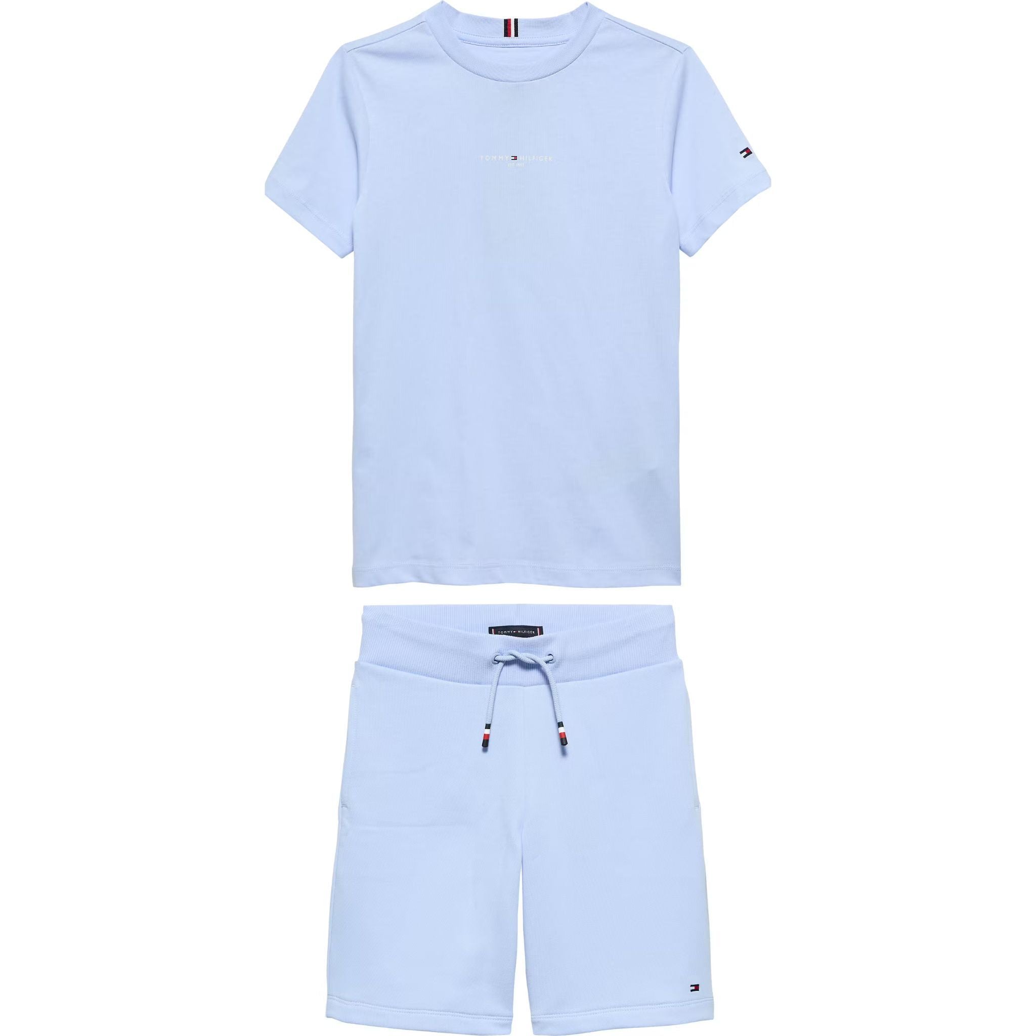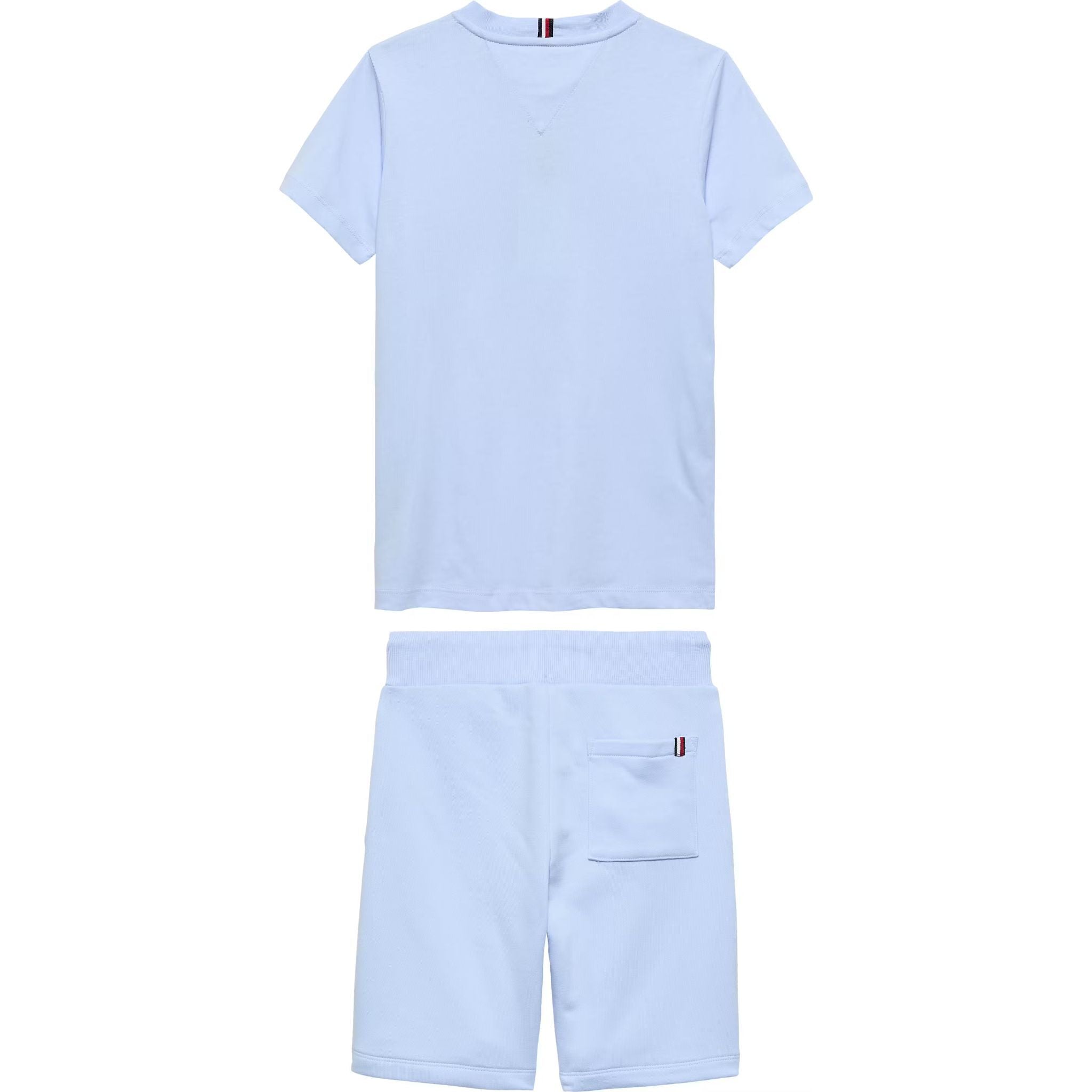 Deze frisse Tommy Hilfiger set bestaat uit een lichtblauw T-shirt en een bijpassende short, ontworpen voor optimaal comfort en een moderne uitstraling. Het T-shirt is uitgevoerd in zacht katoen en afgewerkt met een subtiel Tommy Hilfiger logo op de borst en een kleine flag patch op de mouw. De short heeft een elastische tailleband met verstelbaar trekkoord en biedt veel bewegingsvrijheid. Dankzij de uniforme kleur is deze set tijdloos en makkelijk te combineren.