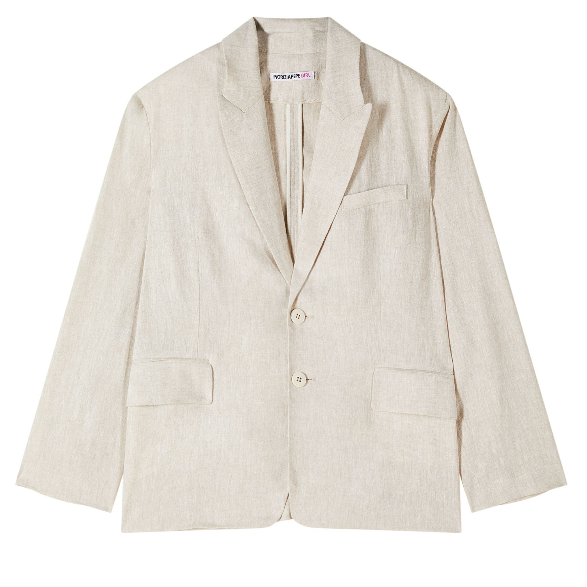 Deze beige linnen blazer van Patrizia Pepe combineert elegantie met zomers comfort. De lichtgewicht stof, reverskraag en klassieke snit maken het een tijdloos kledingstuk.