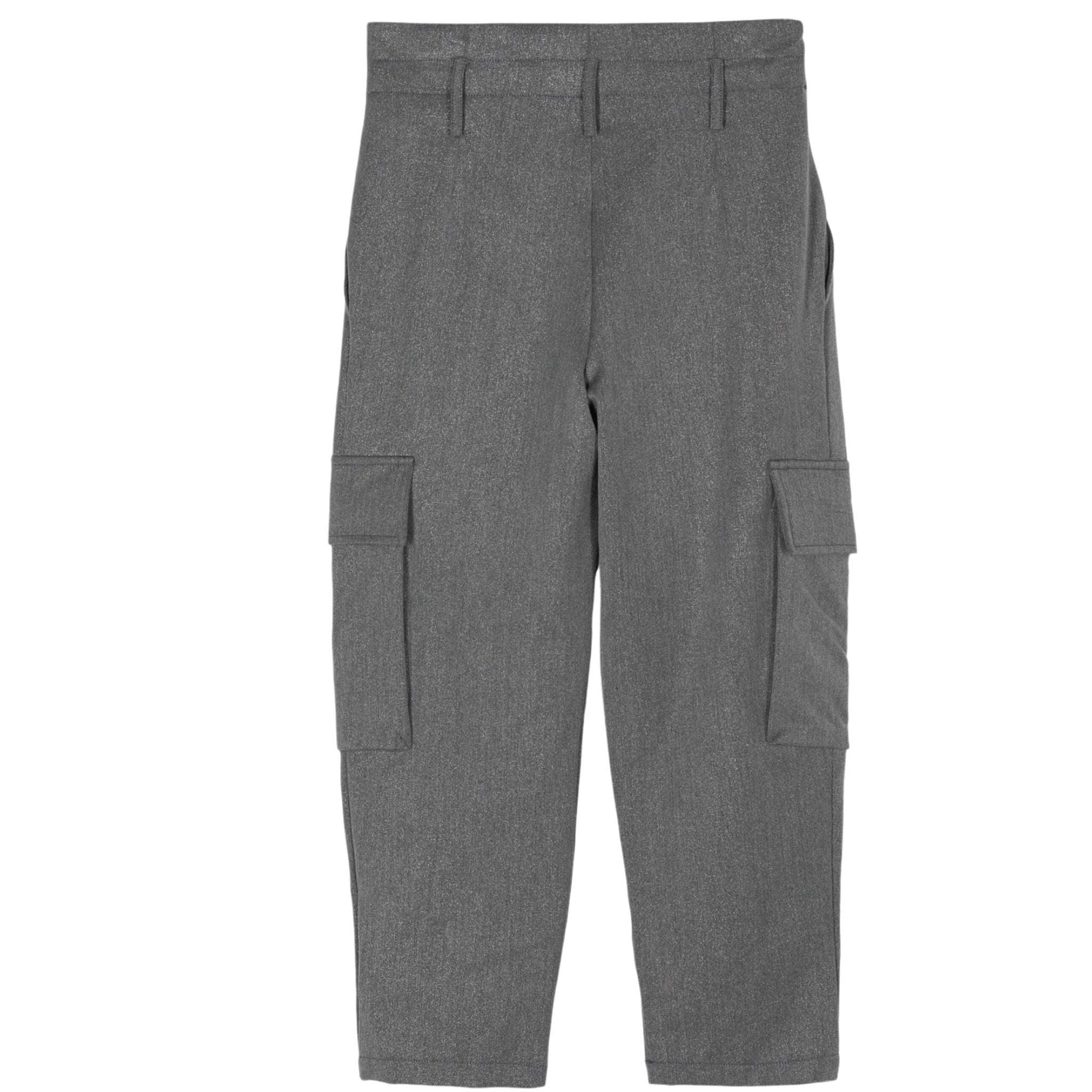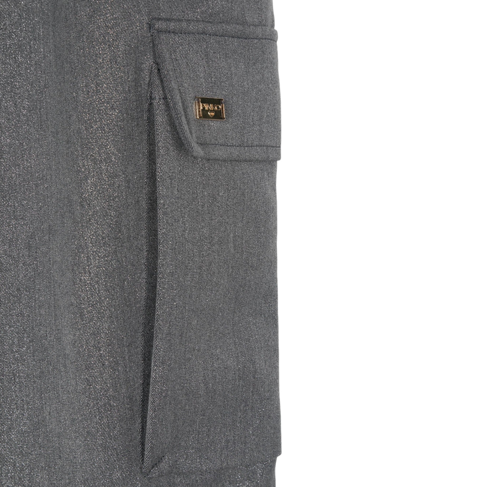 Dit is een broek van het merk Pinko, met een moderne, utilitaire uitstraling. De broek is grijs van kleur en gemaakt van een glinsterende stof, wat een subtiele metallic of glanzende look geeft. Het ontwerp bevat ruime cargozakken aan beide zijkanten van de broekspijpen, wat bijdraagt aan de functionele stijl. De tailleband heeft riemlussen en plooien aan de voorkant, waardoor de broek een gestructureerd, maar toch comfortabele pasvorm biedt. Het geheel oogt modern en stijlvol, met een vleugje casual functionaliteit