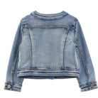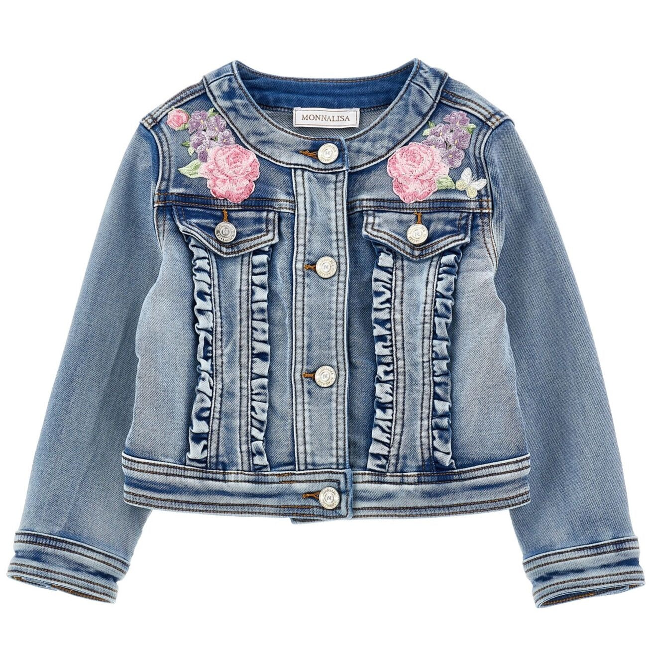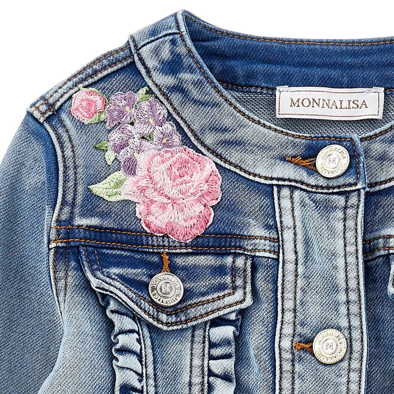 Dit stijlvolle Monnalisa spijkerjasje is een echte blikvanger voor meisjes. Het klassieke denim design is verrijkt met romantisch bloemenborduursel in roze en lila tinten, terwijl de geplooide ruches langs de knoopsluiting een speelse, girly touch geven. Perfect voor zowel casual outfits als feestelijke momenten.