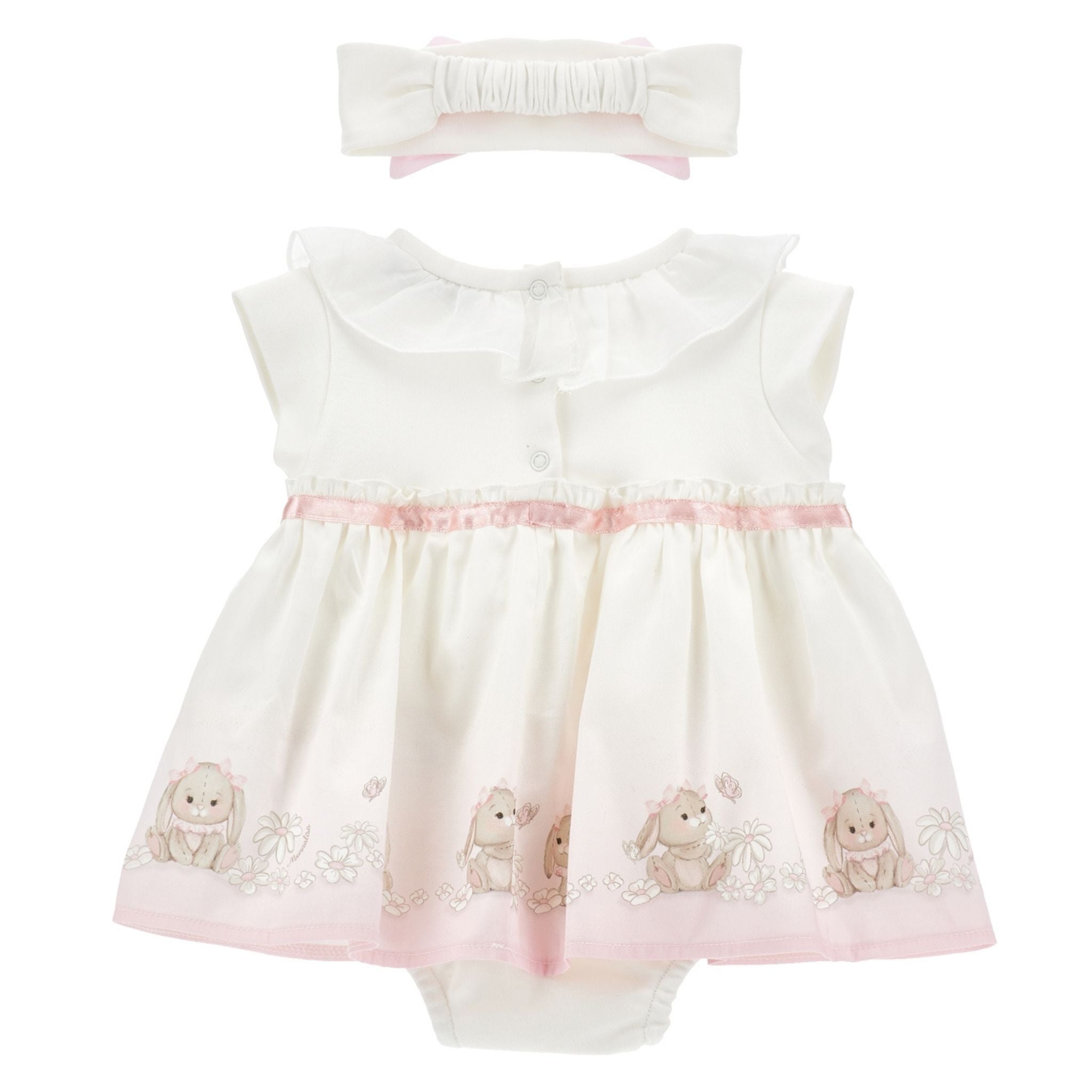 Een complete babyset van Monnalisa bestaande uit een witte jurk met geïntegreerde romper en bijpassende haarband. De jurk is versierd met konijntjesprint en roze accenten. De praktische drukknoopjes maken het aankleden eenvoudig, terwijl de zachte stof zorgt voor draagcomfort.