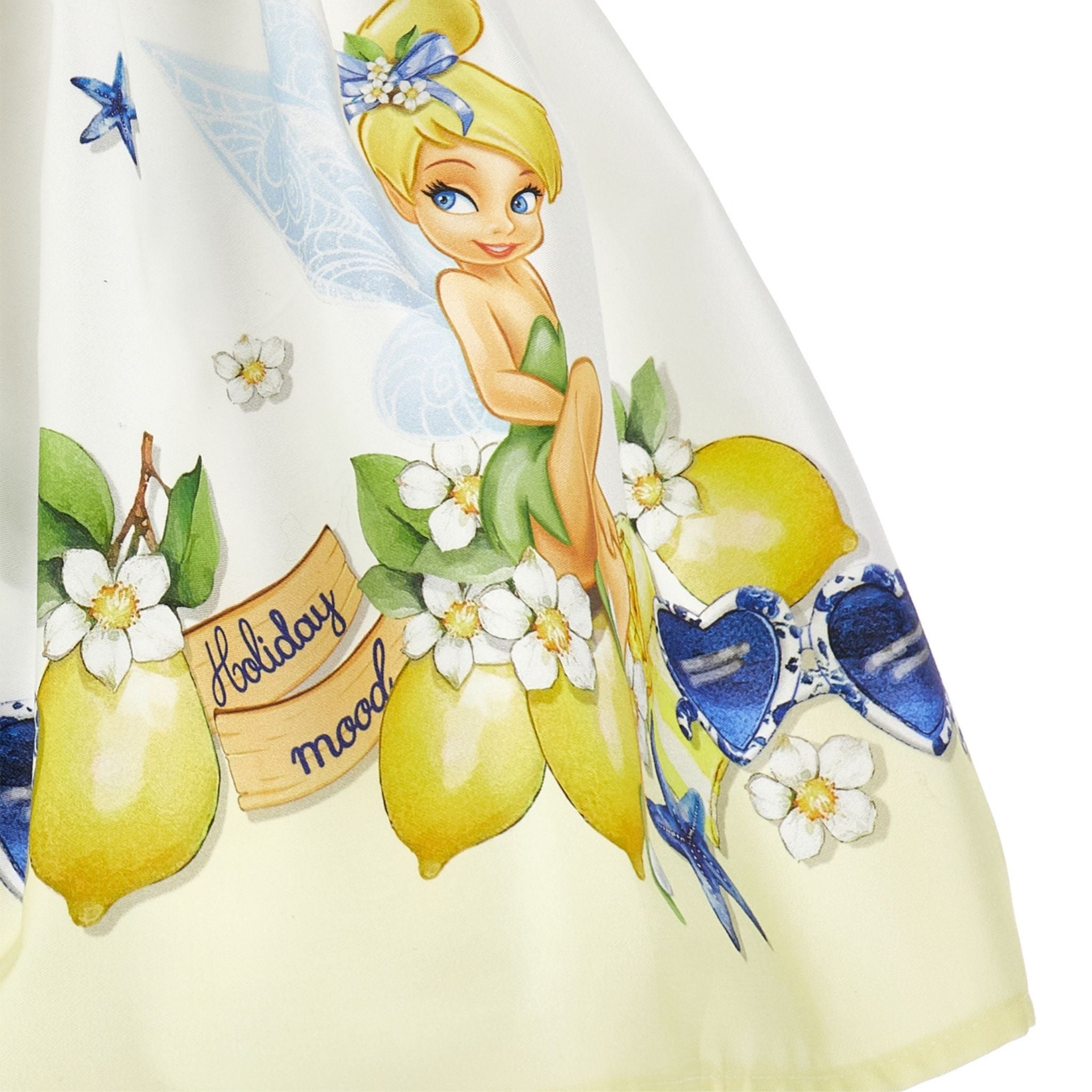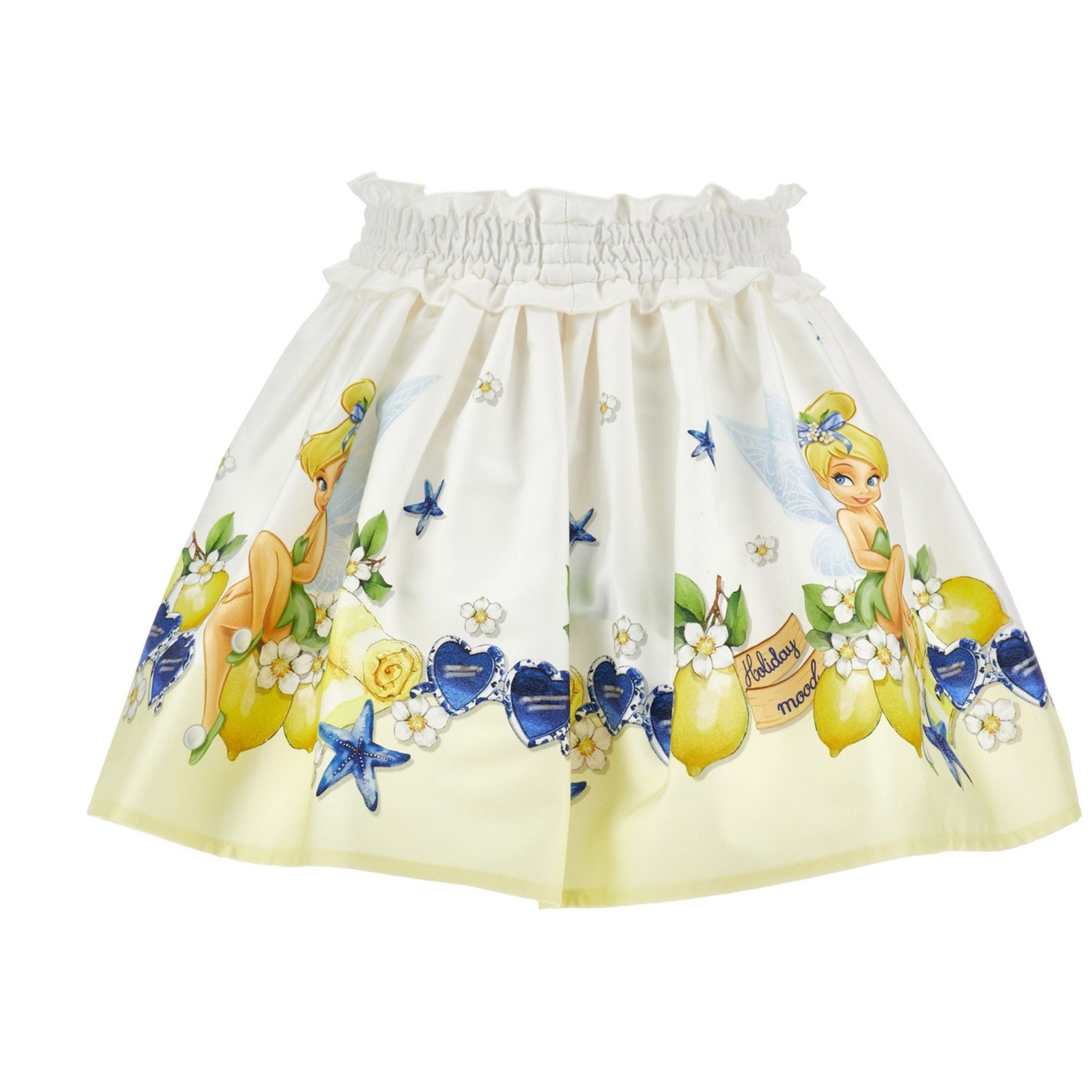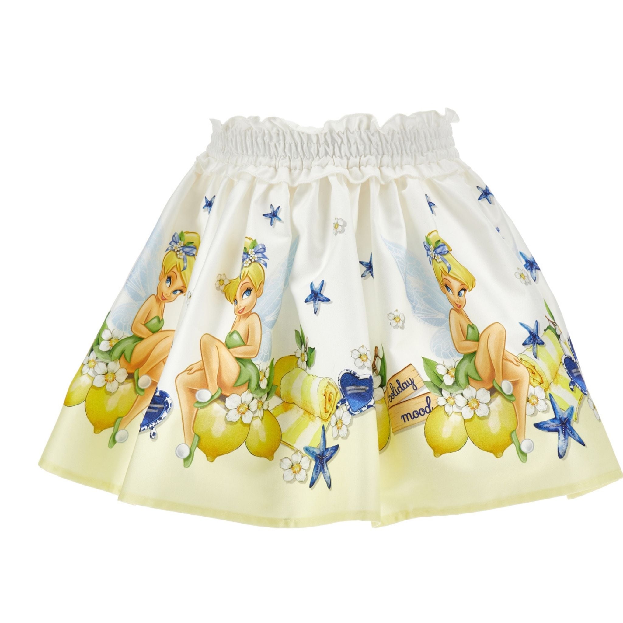 Deze vrolijke Monnalisa rok brengt magie in de garderobe van je meisje. Uitgevoerd in wit met een all-over Tinkerbell-print, gecombineerd met citroenen en blauwe sterren voor een frisse zomerse look. De elastische tailleband zorgt voor een comfortabele pasvorm.