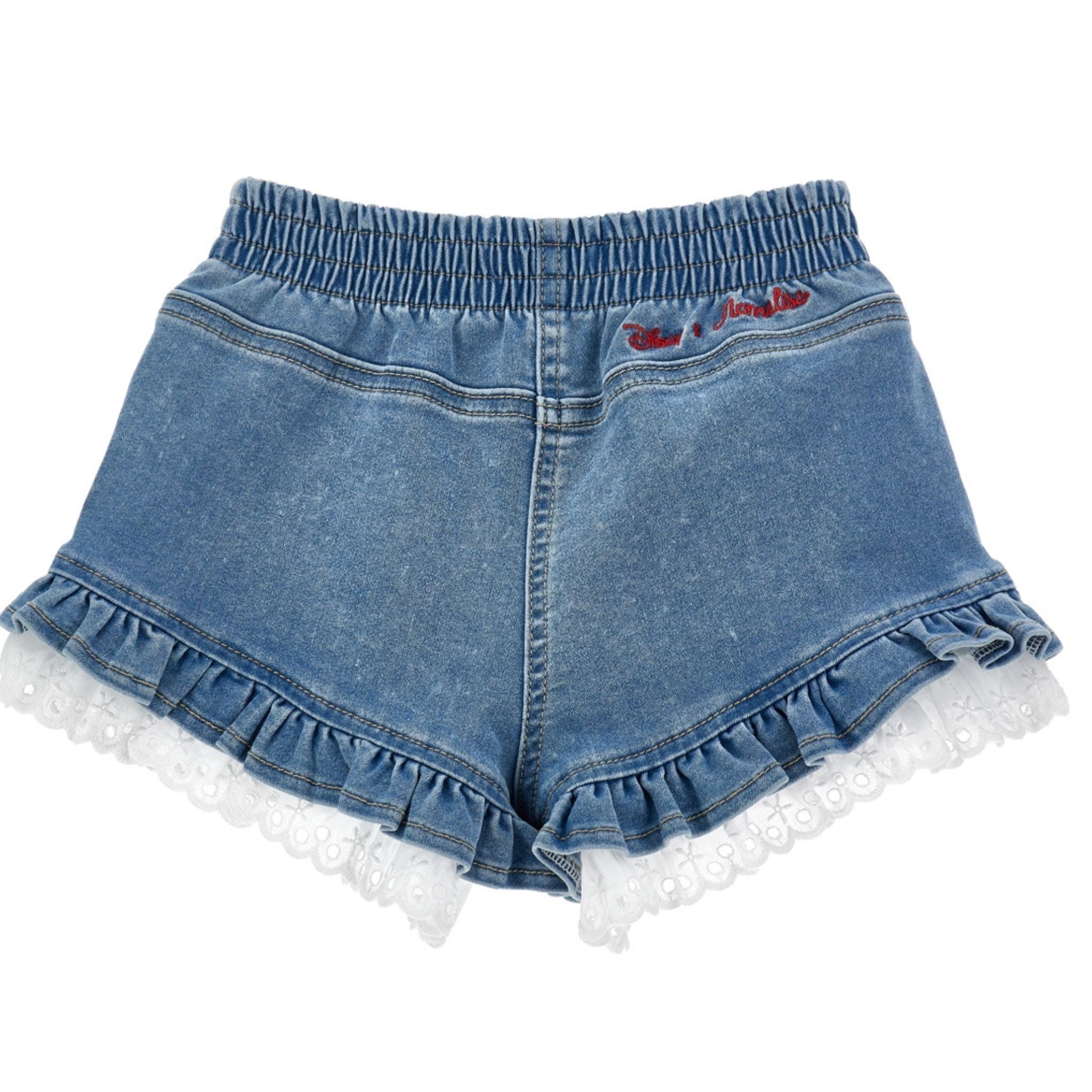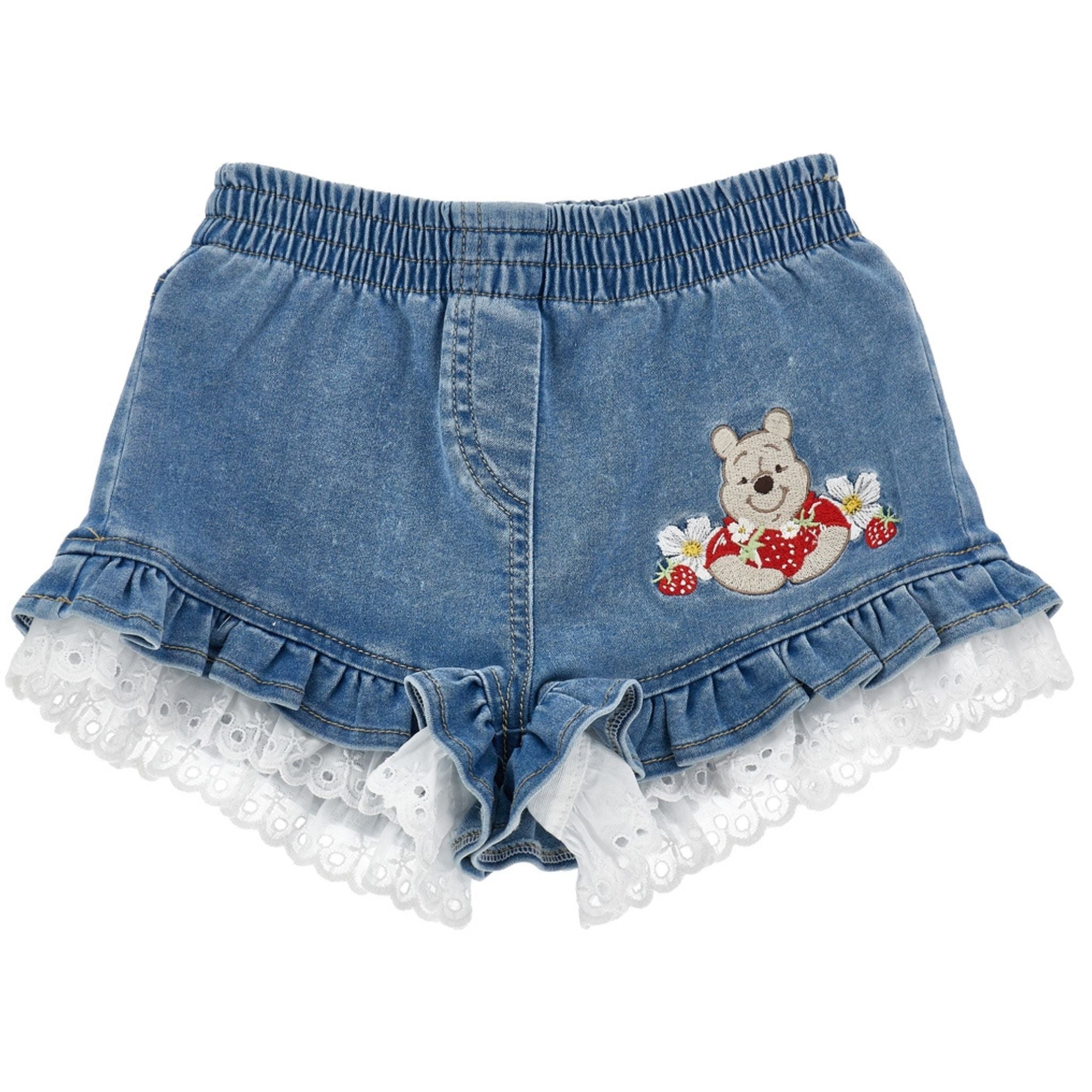 Deze denim short van Monnalisa combineert speels en comfortabel. De short is afgewerkt met ruches, kanten details en een geborduurd Pooh-figuurtje met aardbeien. De elastische tailleband zorgt voor een fijne pasvorm tijdens warme zomerdagen.