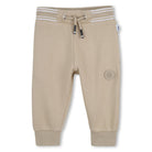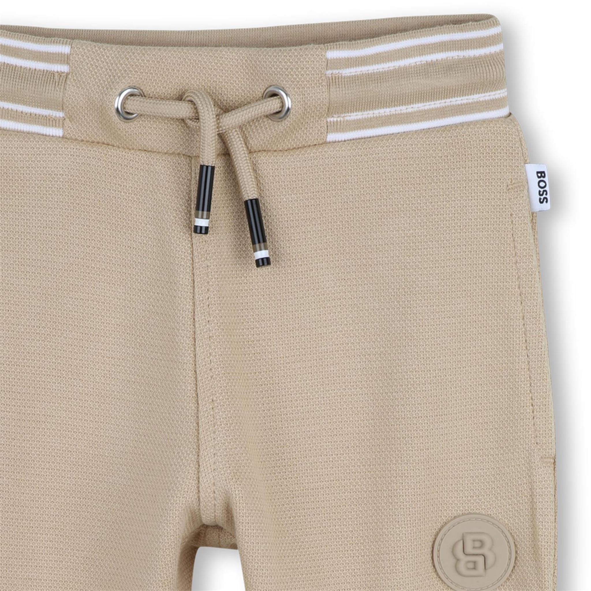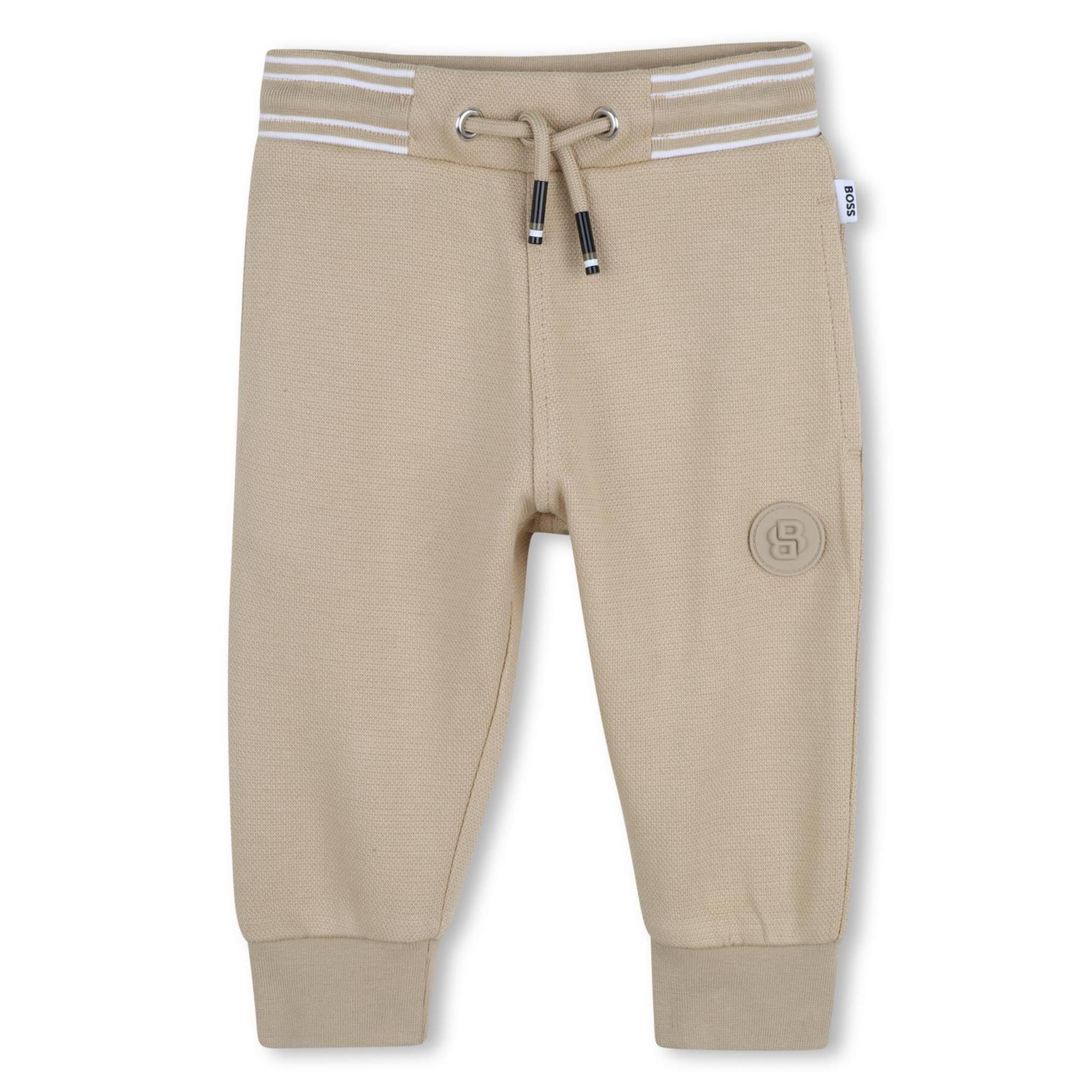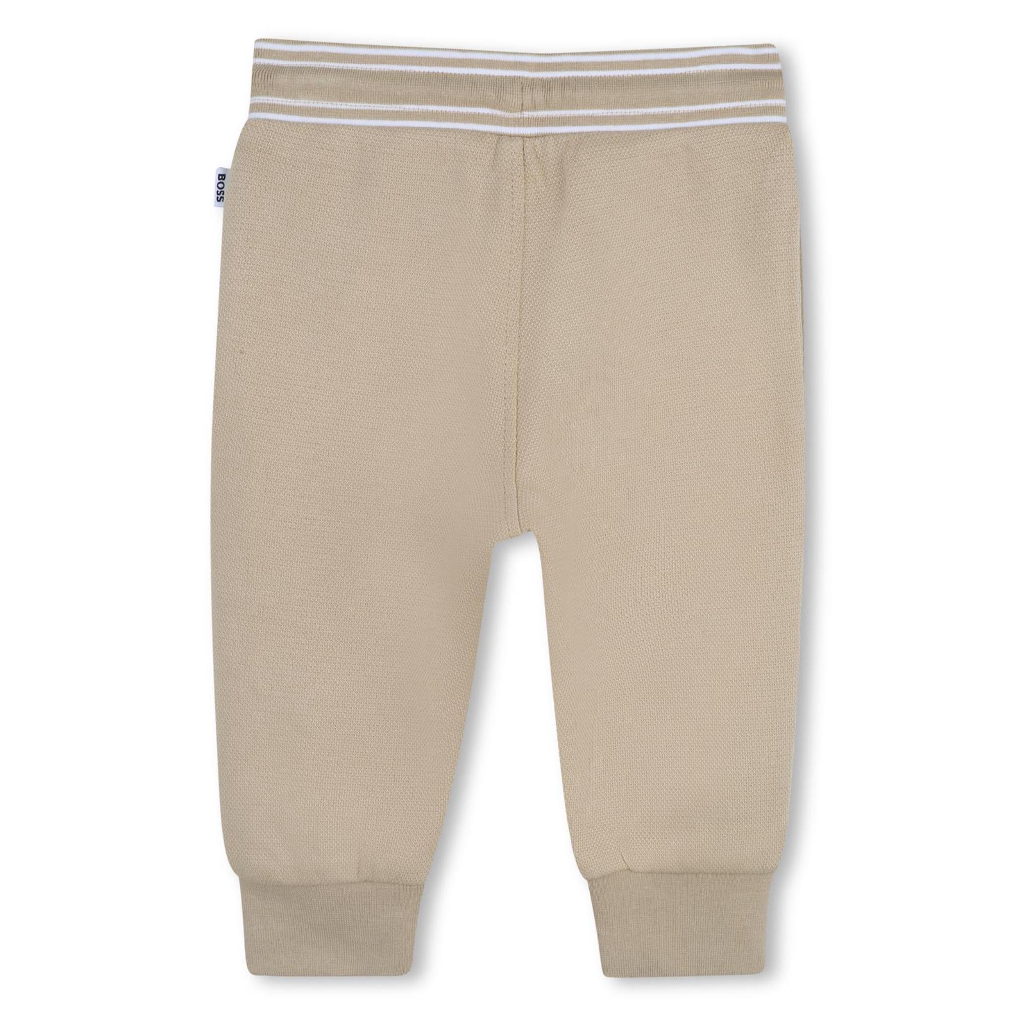 Deze beige BOSS baby joggingbroek straalt pure luxe en comfort uit. De broek is uitgevoerd in een zachte, licht gestructureerde stof die zorgt voor een verfijnde uitstraling. De elastische tailleband met beige aantrekkoord en subtiele witte strepen geeft een sportieve touch.
