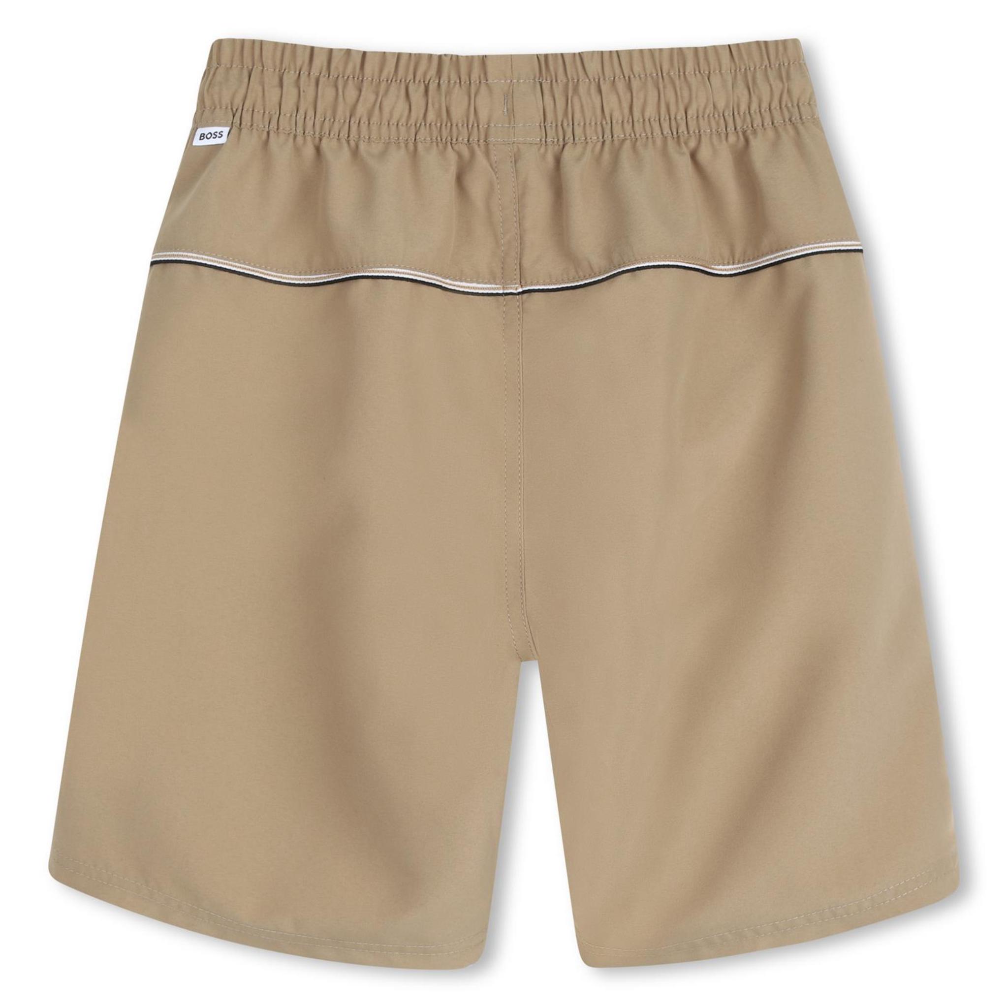 Deze beige BOSS junior zwembroek straalt tijdloze klasse en sportieve elegantie uit. Het model is uitgevoerd in een warme zandkleur en afgewerkt met een subtiele horizontale bies in wit en zwart over de voorzijde. Dit geeft de zwembroek een verfijnde en moderne uitstraling.